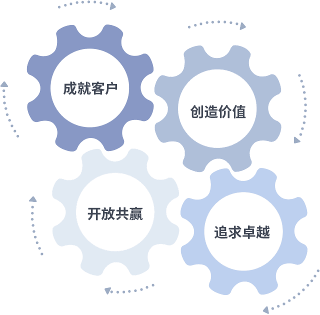 成就客户是一切决策的出发点,,,创造价值是衡量所有工作的标准,,追求卓越是我们做事做人的态度,,开放共赢是我们的格局也是最终的结果。。价值观的齿轮环环相扣,,推动着组织里的每个人不断向前。。。。